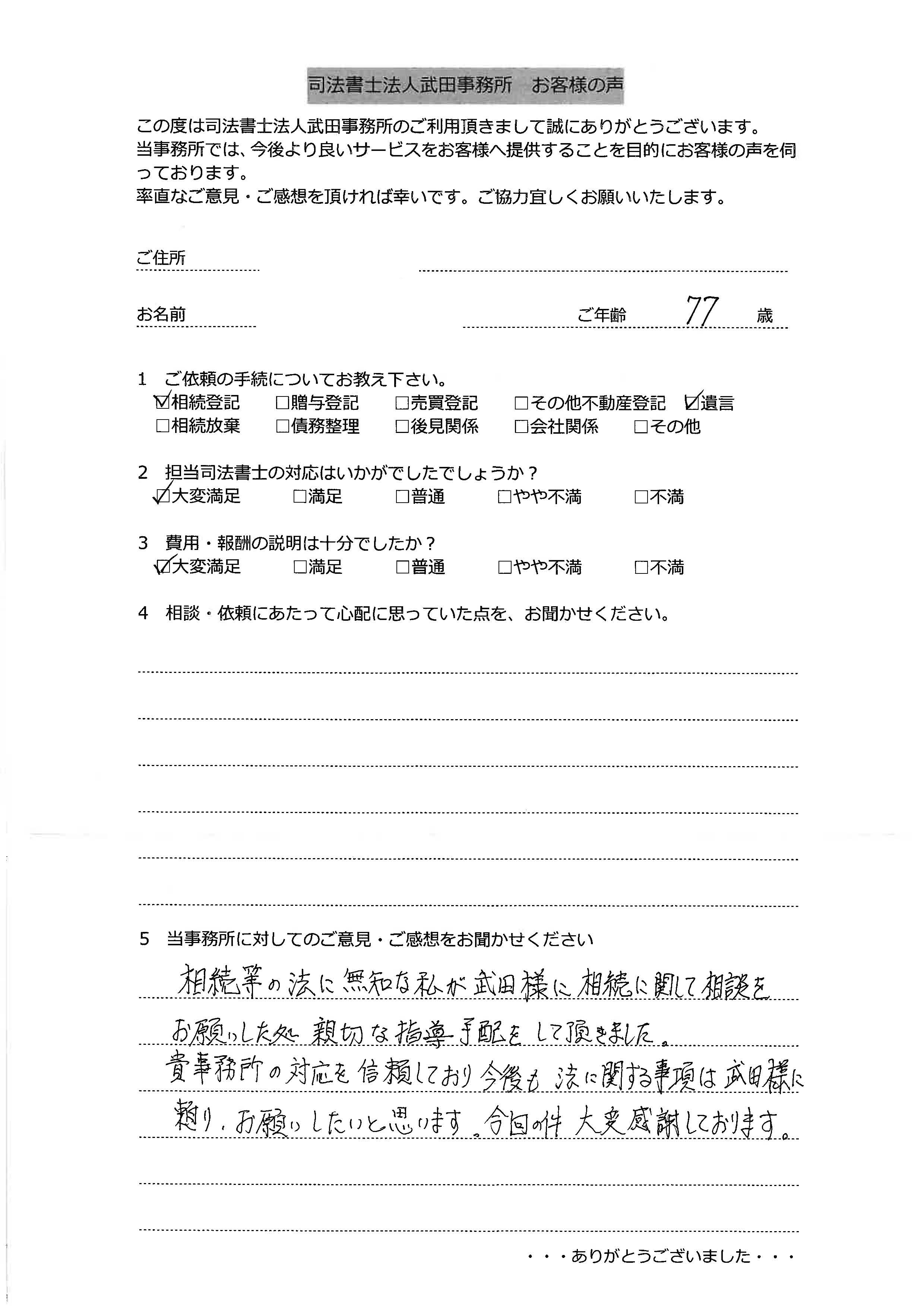■当事務所に対してのご意見・ご感想をお聞かせください。知人に紹介していただき先生にお会いしましたが、お話もしやすく迅速丁寧な対応でとても気持ちよくお願いする事ができました。相続の手続きが一段落して、母娘共に安心することができました。ありがとうございました。また何か相談事がありましたらお願いしたいと思いますのでよろしくお願いいたします。