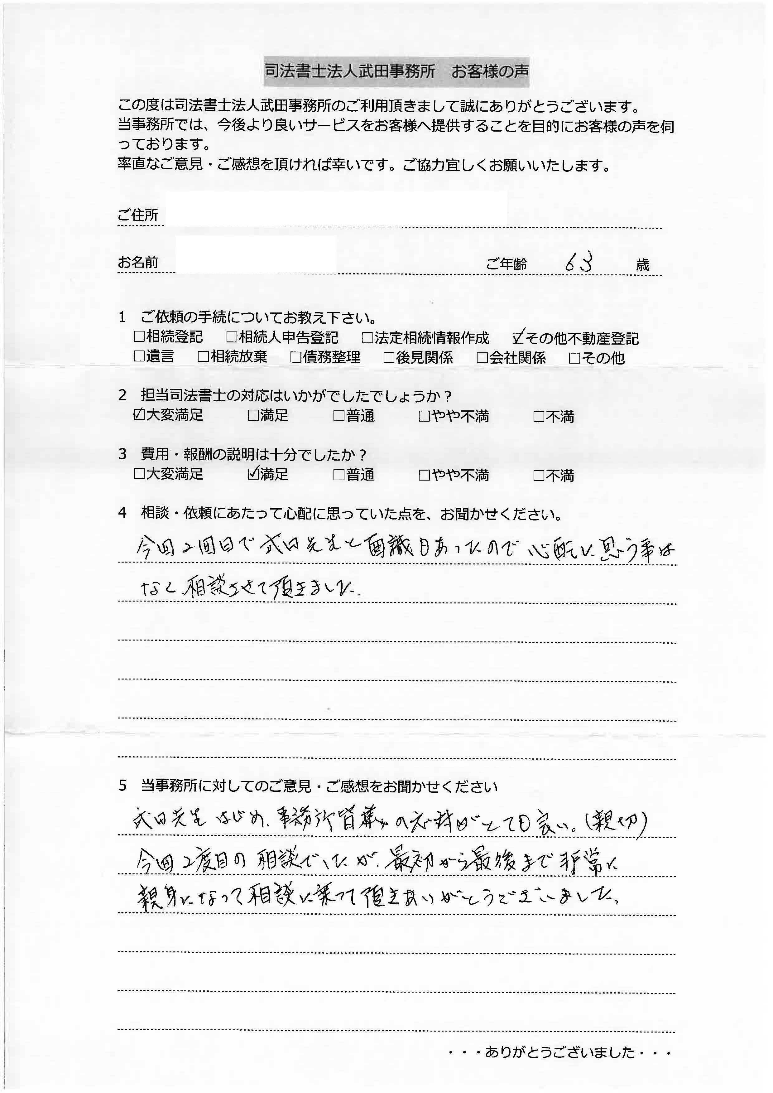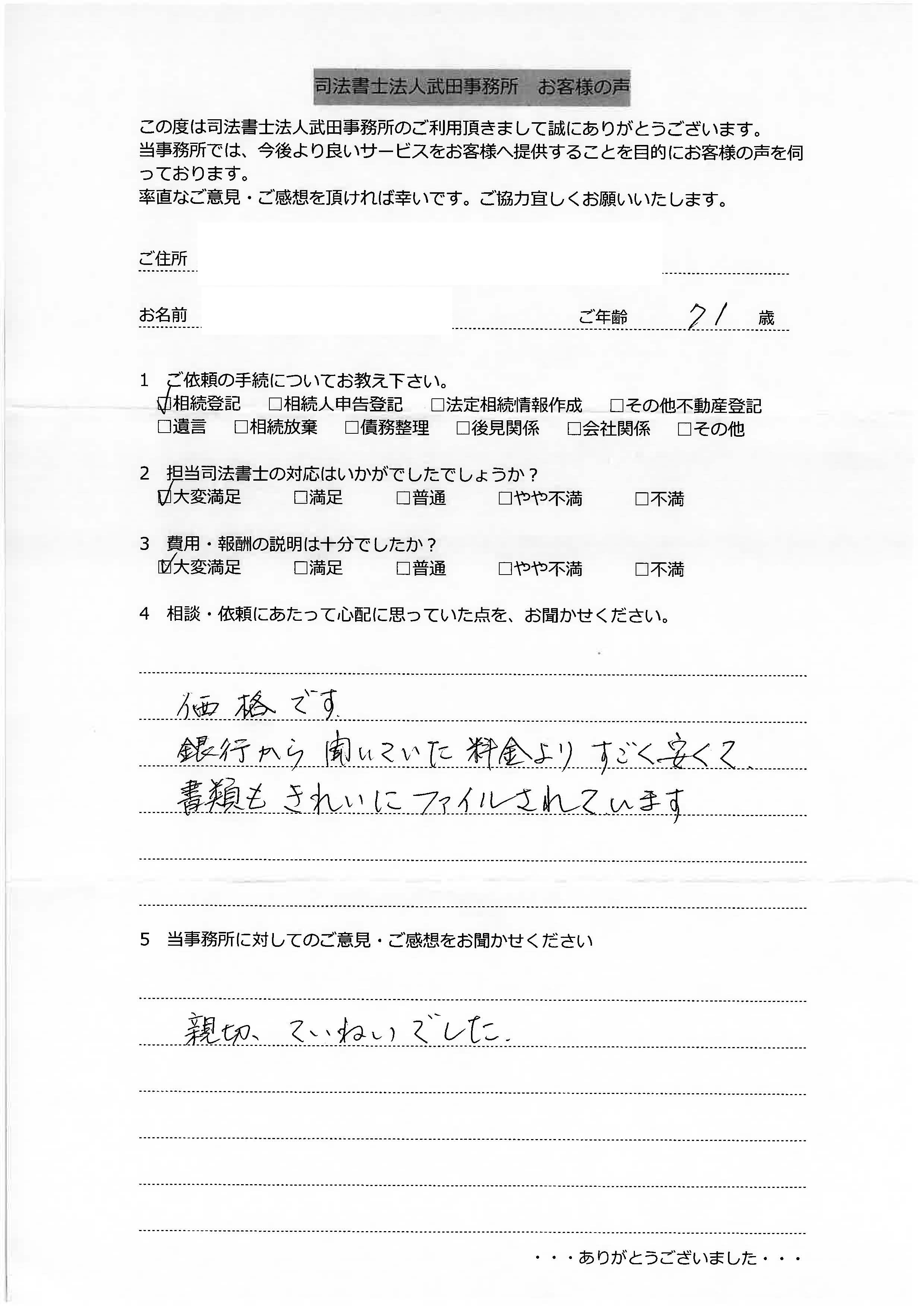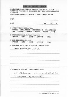 ■当事務所に対してのご意見・ご感想をお聞かせください。知人に紹介していただき先生にお会いしましたが、お話もしやすく迅速丁寧な対応でとても気持ちよくお願いする事ができました。相続の手続きが一段落して、母娘共に安心することができました。ありがとうございました。また何か相談事がありましたらお願いしたいと思いますのでよろしくお願いいたします。