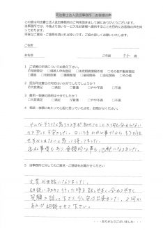 ■相談・依頼にあたって心配に思っていた点を、お聞かせください。父の相続の件でお世話になりました。急な事だったので手続きや金額的なことなど分からない事ばかりで不安もありましたが、相談の段階で分かりやすくきちんと説明して頂き、はっきりとした金額提示もあり安心してお願いする事ができました。